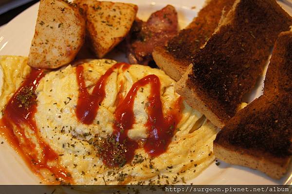 主餐有德國培根、歐姆雷蛋、全麥吐司