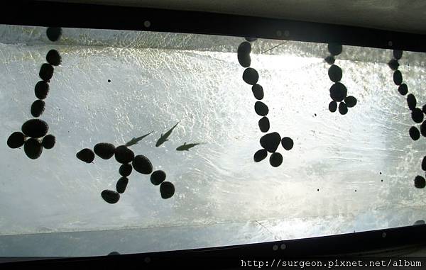 吃飽喝足後,可以到洗手間瞧瞧。那兒的天花板是魚缸,可以採光,又能看魚而水中游。